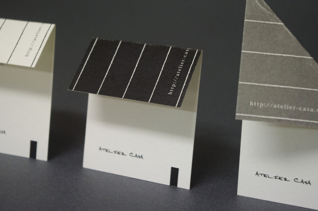 「片面は不可解な暗号に見えて、透かしてみると意味が完成するアートイベントのショップカード」「上の方を折り曲げると屋根のような裏地が表側にでて家になる建築家の名刺」「木の皮デザインにした紙をぐるぐるに巻いて切り株のようにして置くハウスメーカーのリーフレット」