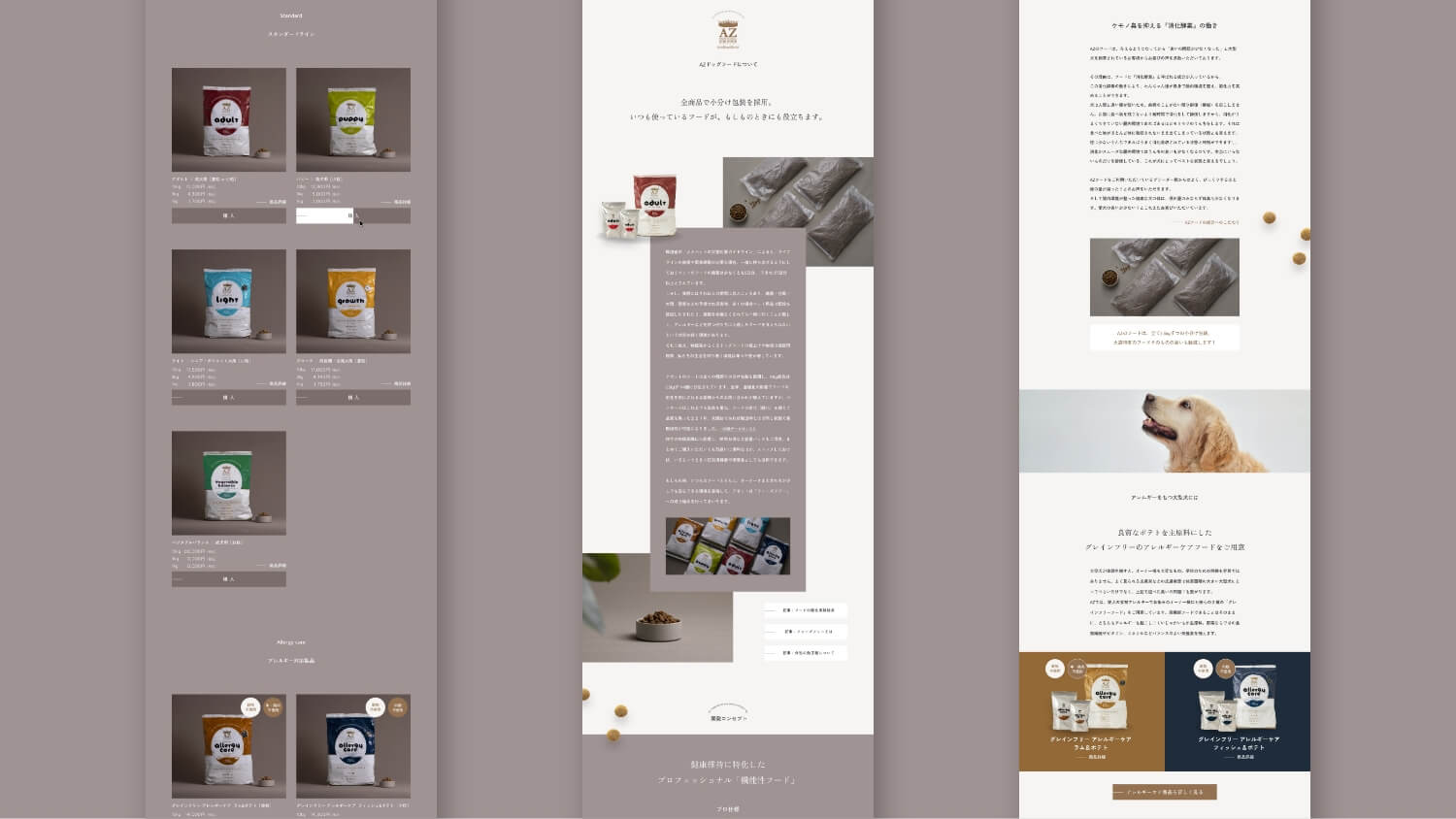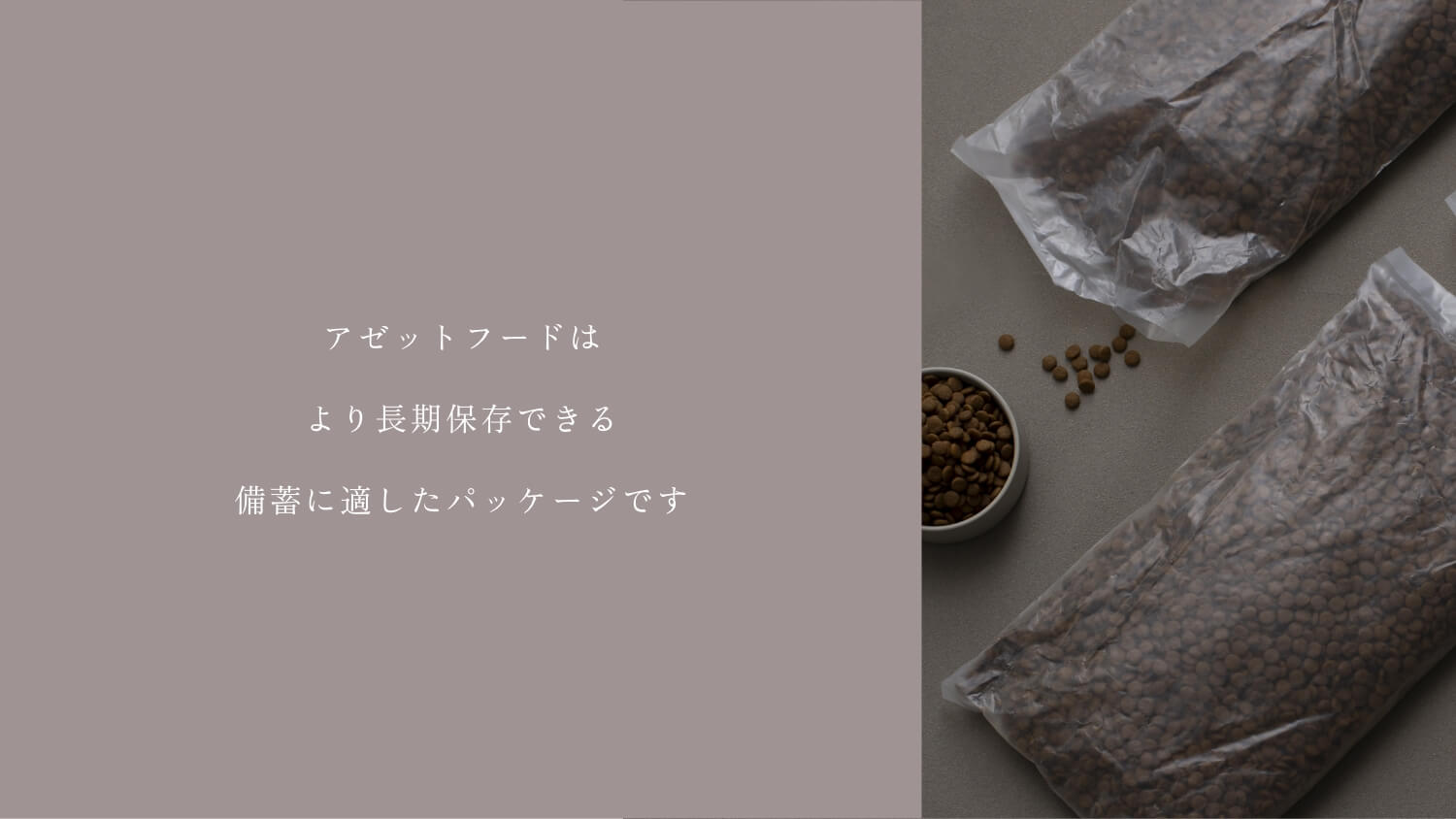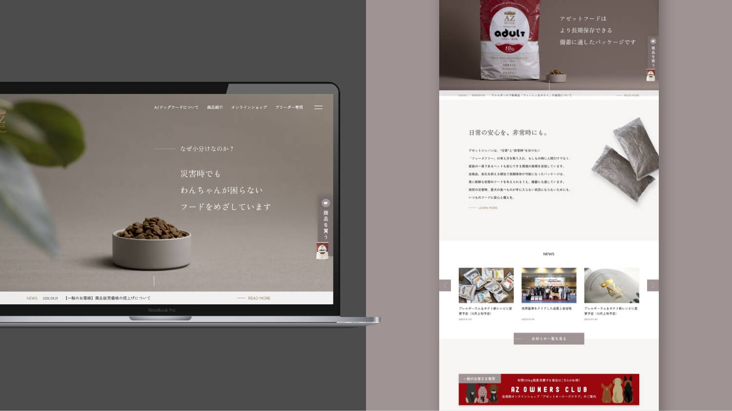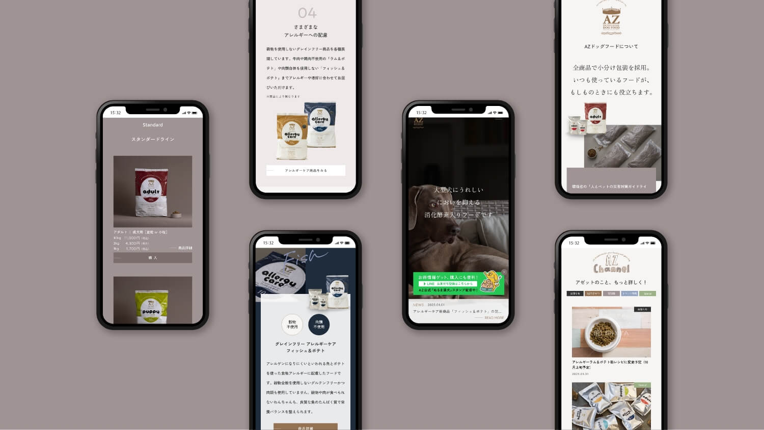 リリースから15年が経ち、公式サイトの改修を機に新たな商品の付加価値と未来に向けた方向性の再定義を行いました。これまでキーワードはドッグファーストで特有の悩みを解決する「素材」「レシピ」の追求とA~Zまでさまざまな犬種(フェーズ)に向いた「商品ラインナップ」。多少価格帯を上げてでも、アレルギーや肌、臭いの問題などにフードメーカーとして向き合ってきました。この「安心」「素材重視」の基本路線はベースに据えつつ、災害や世界情勢により人間同様に不安定となるフード不足の問題に対してのアプローチを全面に据える「フェーズフリー」というキーワードでビジュアルづくりと構成を進めました。